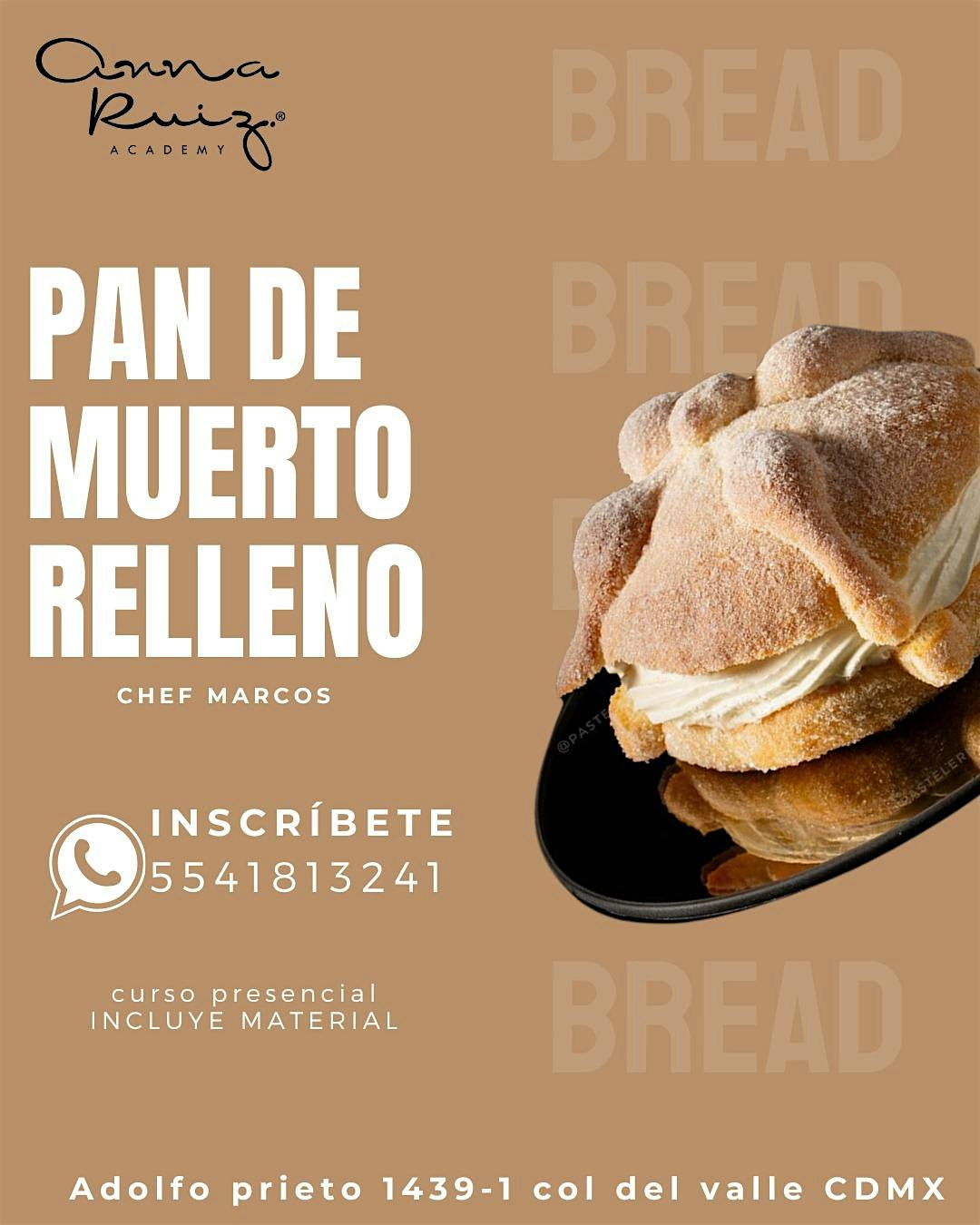 Anna Ruíz Store Adolfo Prieto 1439 - 1, Col Del Valle Centro, Adentro del estacionamiento del Hiperlumen Del Valle, México, D.F., MexicoVen y aprende con el Chef Marcos Valadez, el domingo 31 de Agosto de 12:00 a 16:00 hrs, Aprenderás a hacer Pan de Muerto de sabores¡No te pierdas!¡Ven a disfrutar de un delicioso evento con el Chef Marcos Valadez en Anna Ruíz Store! El famoso chef estará preparando su increíble Pan de Muerto Relleno que no te puedes perder. La cita es el domingo 31 de agosto de 2025 a las 12:00 am.¡No dejes pasar la oportunidad de probar esta delicia en un lugar tan especial como Anna Ruíz Store! ¡Te esperamos!Rellenos de:Higoblueberry quesoNutella